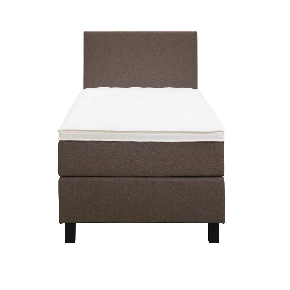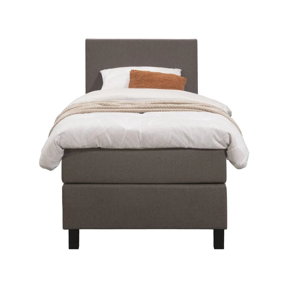 Boxspring Liv is een boxspring met een afmeting van 90×200 cm. Deze prachtige boxspring is bekleed met een grof geweven donkerbruine stof en heeft een strakke uitstraling met een egaal hoofdbord. De Liv egaal is uitgerust met een pocketveringmatras en daarnaast ook nog een koudschuim topdekmatras voor extra comfort. Het pocketveringmatras is omkeerbaar, bestaande uit zowel een medium- als een stevige kant. Hierdoor kun je zelf kiezen wat voor jou het meest comfortabel ligt.
