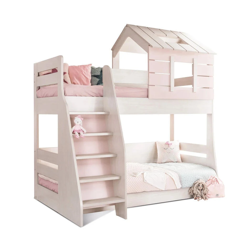 Het witte met lichtroze Cento Pink stapelbed is een prachtig bedhuisje speciaal ontworpen voor de meisjeskamer. Dankzij het unieke design en de stevige valbeveiligingen is dit bed niet alleen veilig maar ook stijlvol. Het bovenste bed heeft een afmeting van 200 x 90 cm en het onderste bed meet 200 x 100 cm, waardoor beide kinderen ruim en comfortabel slapen. Met het dakje boven het bovenbed krijgt dit stapelbed een gezellige en speelse uitstraling die perfect past binnen de Cento Pink meisjeskamer.