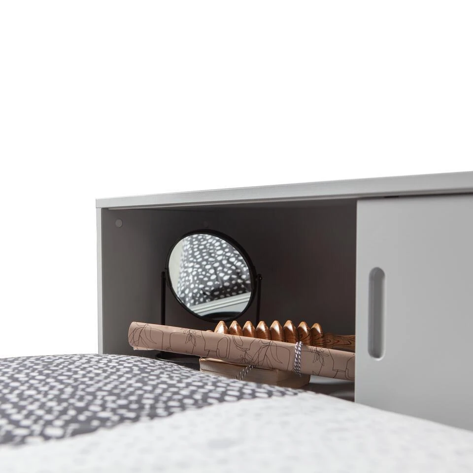 De twee opbergvakken achter de schuifdeur hebben een breedte van 104 cm en hoogte van 26 cm. De hoogte waar het matras op komt te liggen is 17 cm.
